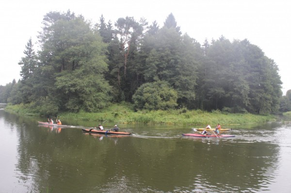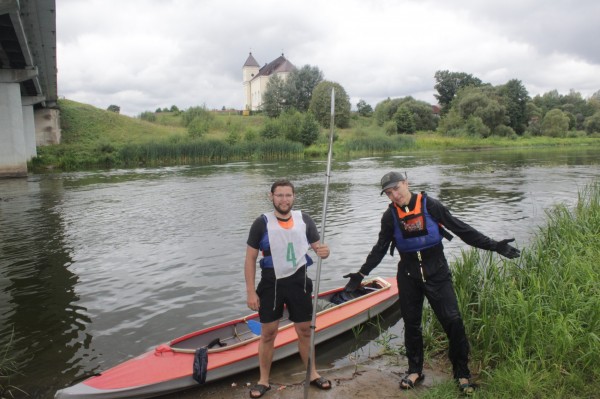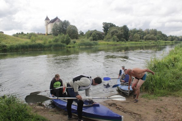 Возле Маркунов команда преследователей на черном пластике предприняла очередную попытку обогнать нас по меньшему радиусу. Но сильное течение под левым берегом помогло нам сохранить позицию. За тем, блуждая меж островов, мы стали терять их из виду. Но они не торопились отставать. Хотя и шансов на обгон у них оставалось все меньше. Вскоре вдалеке показалось высокое строение с пиками башенок, увенчанных крестами. Это определенно был костел Святого Михаила в Михалишках. Мы были уже рядом с финишем. Теперь силы можно было не экономить, и мы задорно маслали к своей цели.