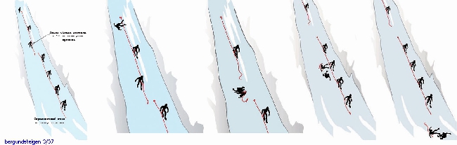 Он стоял без самостраховки у точки закрепления верхней веревки, в то время как на ней одновременно находились двое человек. Остальные четверо уже начали спуск по нижней веревке. В этот момент небольшая лавина опрокинула руководителя и сбила его с ног. Самозадержание не удалось, и срыв перешел в неконтролируемое падение. Пролетев около 35 метров, упавший миновал верхнего спускающегося и столкнулся с нижним, после чего страховочная веревка оборвалась при рывке (см.схему аварии)