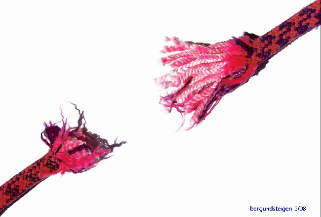Этот друг также задавал вопрос: «почему обрыв произошел на относительно несложном маршруте?» Очевидно, люди недостаточно понимают, что сложность маршрута необязательно является решающим фактором для опасности обрыва веревки. Скорее напротив - чем меньше степень сложности, тем больше риск разрыва веревки и наоборот: чем выше степень сложности, тем более незначительна эта опасность. Граница лежит примерно в районе VI./VII категории сложности по шкале УИАА.