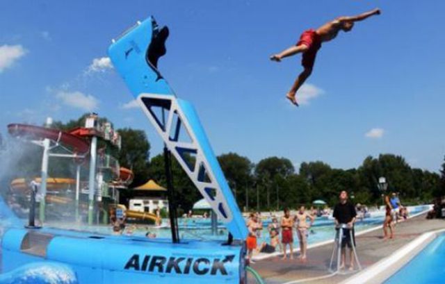 Airkick(R) – еще один вид экстремального спорта, который еще называют «человеческая катапульта» (думаю, это название ставит все на свои места). Специальное метательное приспособление подбрасывает экстримала вверх по предварительно рассчитанной траектории с использованием давления воздуха и технологии обратного хода воды. Экстримал нажимает на кнопку, чтобы поднять себя в воздух на 8 метров, и на большой скорости летит в бассейн с водой. При этом очень важно правильно входить в воду: если упасть плашмя, животом, то можно получить серьезные повреждения! Это занятие явно для тех кому обычный сборный бассейн для дачи уже мал.