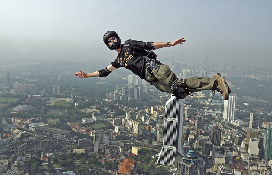 Тем, у кого есть тяга спрыгнуть с очень высокого здания… явно требуется помощь специалистов! А вот тем экстрималам, которые уже устали от банальных прыжков с парашютом, в поисках острых ощущений поможет бейсджампинг. От обычного парашютизма он отличается тем, что бейсджамперы прыгают с парашютом с фиксированных объектов, как в парапланеризме. Существуют четыре типа фиксированных объектов для бейсджампинга: здания, антенны, пролеты мостов и скалы. Опасность заключается в том, что времени для того, чтобы парашют раскрылся – очень мало, поэтому необходимо дернуть за кольцо в самом начале прыжка, иначе последствия могут быть плачевными.