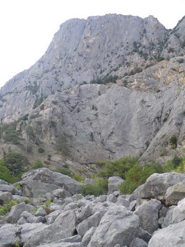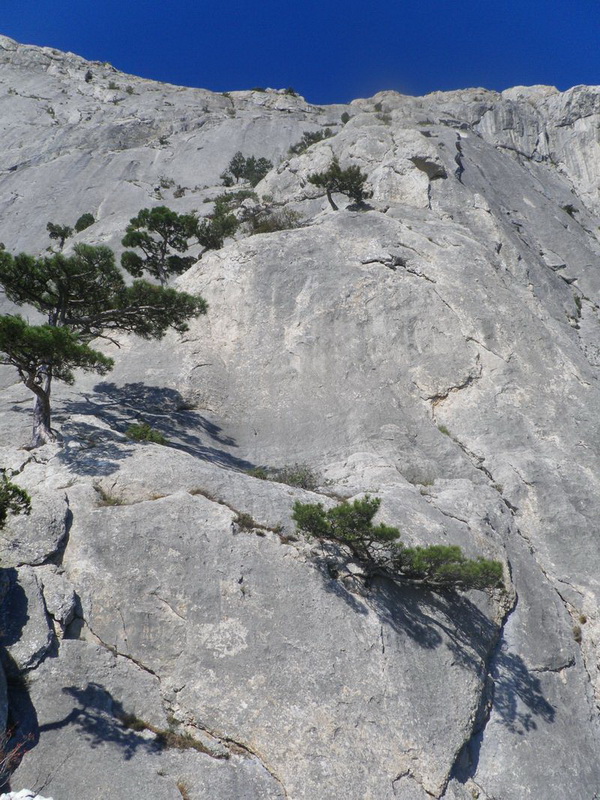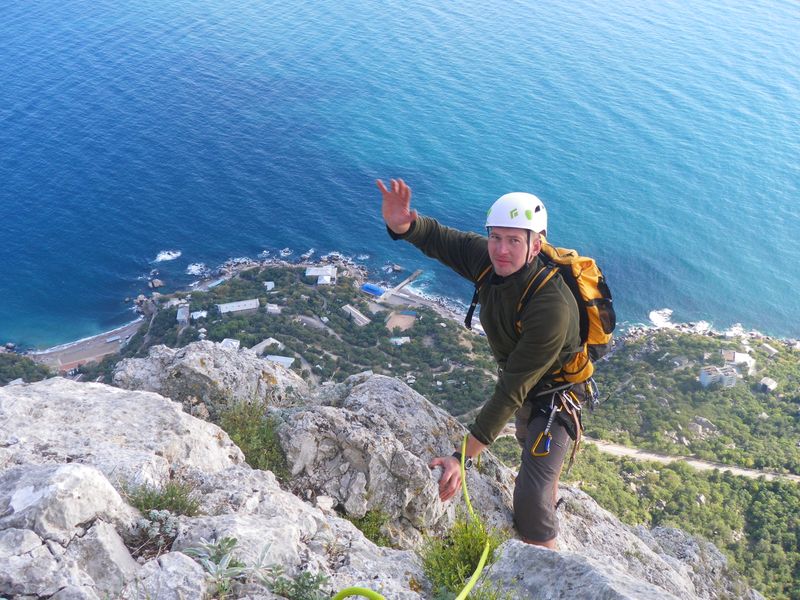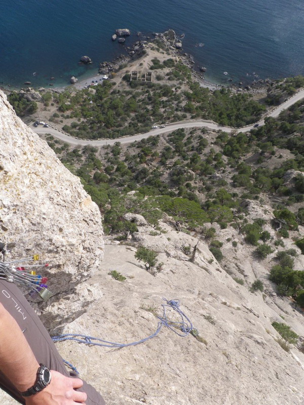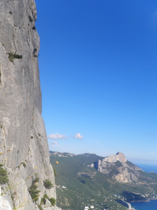 За 2 веревки до верха пошел дождь. Скала сразу же стала скользкой. Попробовали не обращать на это внимания, но не получилось. ИТОшить не хотелось совсем. Да и не вертикаль, не удобно. Сидели, ждали погоды, любовались на море. Дождавшись, быстро вылезли на яйлу и ушли в лагерь.