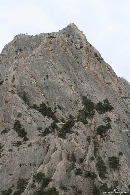 Вообще данный выезд у нас проходил под знаком «куда кривая выведет». Описаний не читали, в лучшем случае видели нитку маршрута, железо брали не то, которое требует маршрут, а то, к которому лежала душа. Да и лезли так, как считали логичным (описания то не читали). Вообще с собой-то у нас гайдбук был. На ФорКант. Иногда мы выбирали в нем что-то и прочитывали в рамках подготовки к следующему маршруту, но не дочитав, бросали, резонно рассудив, что коль гора не совпадает, то и описание может не совпасть с реальностью. Но теперь начали поиски описания. Нитку маршрута даже нашли. И категории веревок. На этом и все, но ведь и то мясо. Предшественникам было хуже. В шкурах… на деревьях...