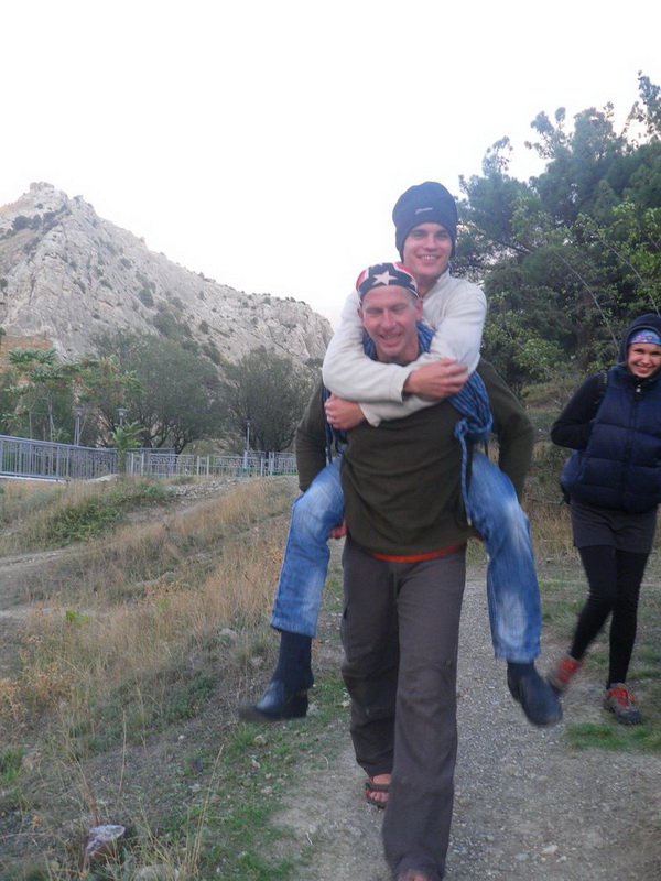 Закончилось все на минорной ноте: Леша полез провесить своей жене простой (6а) маршрут для своей девушки. В самом верху, заложив траверс на соседний маршрут (лазанье простое, можно импровизировать), взял в руку оттяжку и потянулся ей к верхнему шлямбуру. Левая нога резко соскользнула. Ниже – выполаживание и я (на страховке), чтобы выбрать слабину и уменьшить пролет, прыгаю взад-вниз со склона. Крик, рывок, пролетевшая мимо оттяжка и тишина. Леша делает странный кульбит и повисает каким-то комком. Причина – траверс и веревка, проходящая за правой ногой вправо. Натягиваясь, она зацепила ногу и, рванув за нее, развернула тело. До выполаживания не долетел. Дальше стон, мат (наверное) и вот я плавно спускаю Лешу, старающегося не зацепить ногой скалу. Внизу осмотр (вроде все нормально, но есть резкие припухлости), на ногу наступить не получается. Эластичный бинт, кетанол (таблетка), покой. Если растяжение, минут через 15 можно будет идти. Собрались, но идти – нет. На ногу все равно наступить не получается. Весело гогоча, начинаем транспортировку пострадавшего. В результате проще всего получается нести Лешу «верхом»