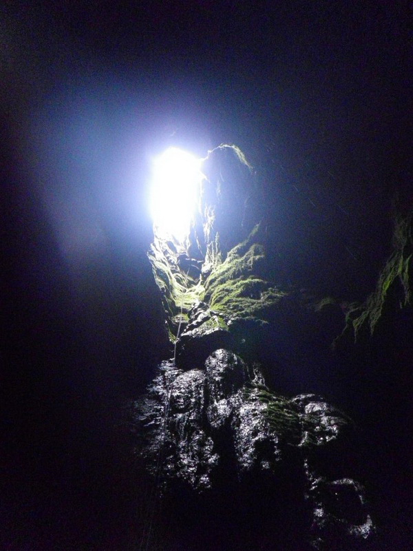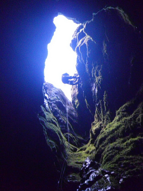 Навесили базу и по старой дубовой веревке, пользуясь 2-х веревочной техникой спустились вниз.