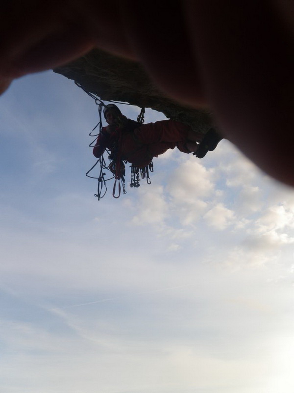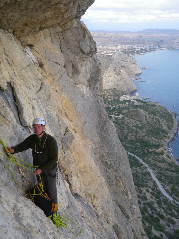 Веревка поползла быстрее, еще быстрее и вот уже она вся. Хрип по рации гласит: «страховка готова». Разбор станции (она, как и карниз на своих точках), лазанье, перемежающееся ИТО от точки к точке. Рома коварен. Стоя на следующей, надо добыть предыдущую. А она далеко и подклинена. Как можно так засунуть кам?... В какой то момент я выстегнул все точки до козырька, остался на лесенках. Теперь веревка идет вбок и от скалы, но не мешает. Расклиниваюсь чем попало в трещине, выдираю френд. Слизь и там. Вишу на веревке, качаюсь. До козырька метра 3, до стены – 4. Костяшки в лохмотьях кожи. Веревка (9.2мм) трется о козырек. Большие глаза страха ясно видят лохматость в месте трения. Воображение дорисовывает. Дергаться бесполезно, любуюсь краявiдамi. Здорово. Редкой красоты панорама. Вся стена Сокола видна. Но так жить нельзя, надо выбираться. Абы-как, с помощью тиблока и матери лезу по веревке. Вторая попытка извлечь железо. Теперь – умнее. Не полагаясь на силу. Собрал и развесил по себе, как попало. Все-таки надо учиться ИТО. Снаряжения при данной технике в разы больше, даже такая вещь, как его не правильное размещение, может полностью парализовать незадачливого спортсмена)))