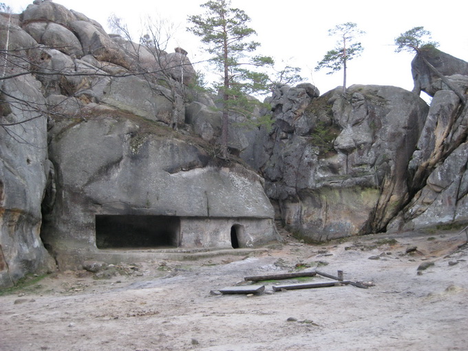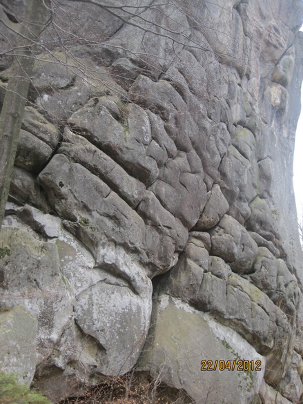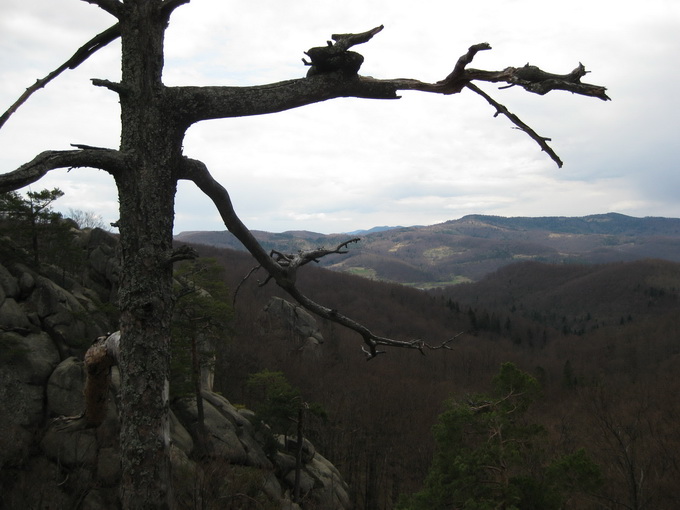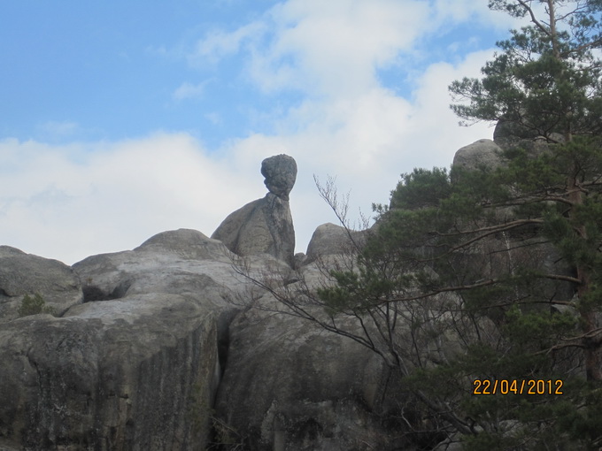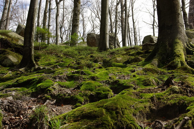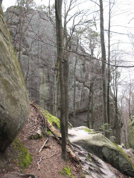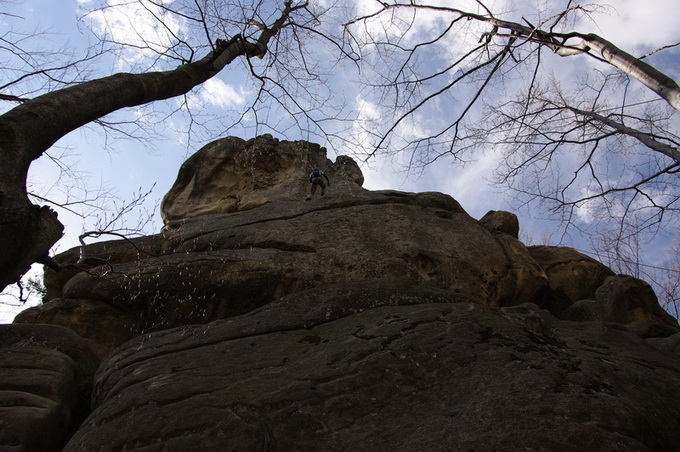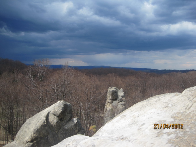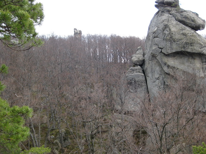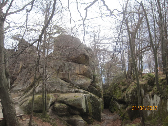 Скалы Довбуша. Эти останцы здесь до 80 метров высотой. Они своеобразны по своему составу. Это мягкие глыбы, будто известняк или сильно спрессованный песок. Скалу можно легко поцарапать чем-либо твердым. Немало нацарапано вандальских надписей. Вершины скругленные в виде площадок или хотя бы просто плавные. Цвет серый, вблизи с желтоватым оттенком. Формы особенно причудливые. Может быть широкое основание и сужающийся кверху неправильный конус, как все равно развесное мороженое из автомата. Или наоборот более малое в своем сечении основание и болеее массивная грибовидная часть кверху. Поверхности расчленены глубокими морщинами, трещинам, рытвинами и бороздами. Хватает терасс, балконов, уступов. Есть с теневой стороны замшелые влажные стены и камины. Все это затенено рослыми деревьями (бук). Теперь листва еще не распустилась, и было не так тенисто. Основной есть здесь массив, и отдельно расположенные глыбы, все именные.