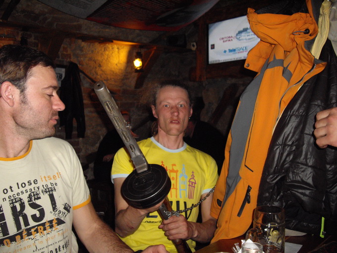На входе из фляжки он же наливал всем наливку. Отказываться нельзя. Фэйс контроль. Прошли все. Подвал был на много отделений. В одном из них нам нашли столик, что побольше. Через два с половиной часа, правда, он заказан, но нам, пожалуй, и хватит. Был в подвале полумрак. Доски, автоматы ППШ, радиостанция, простыни со сводками, положениями и прокломациями. Короче, все портил только идущий большой ЖКИ-экран телевизора.