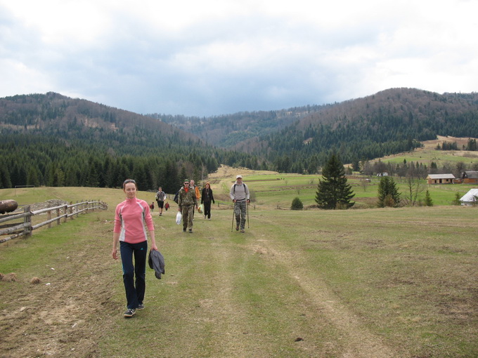 Пешком шли от деревни Труханiв. Стежка велась на пологий подъем в лесу. Буковые деревья, еще голые, серебрились своими могучими гладкими стволами. Соседствовали здесь также ели с пихтами. На жирной черной земли лежал ковер грязно-рыжих прошлогодних листьев, уже подсохших. Было тихо, душевно и привольно (особенно когда под мухой, и все позитивное кажется еще позитивнее). Через свободные от листьев ветки просвечивало голубое небо, и проникали сюда даже лучи солнца – еще не жаркого, а только лишь едва-едва по этой поздней весне пригревающего.
