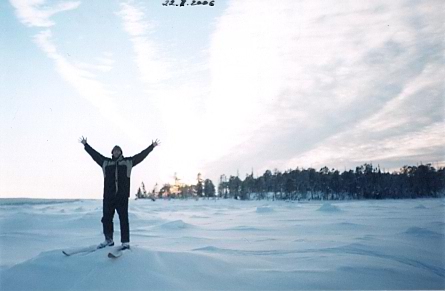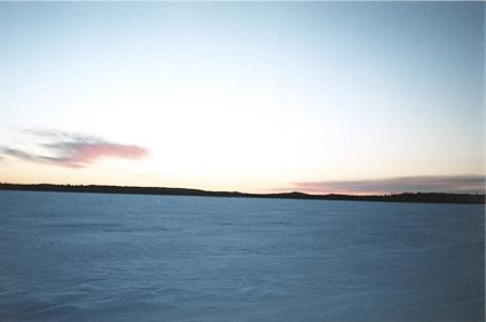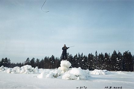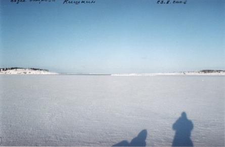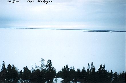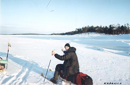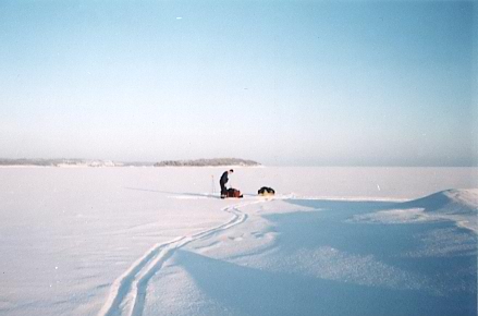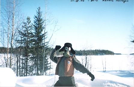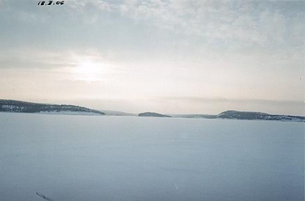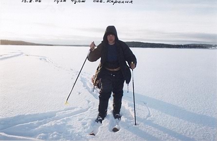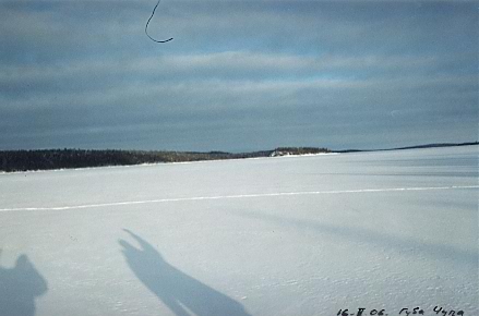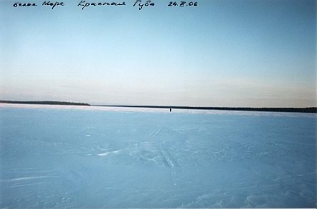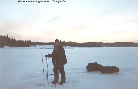 Спали четыре часа. Ситуацией я пренебрег. Снял куртку и ограничился одним спальником, поэтому было зябко. -12. Рука уже запаливал кастрик. Я же на льду нарезал петли, пока не перестали стучать зубы. Я зимой по утрам всегда долго согреваюсь. Вечером обычно не мерзну. Светло, погода ясная. Чаю дожидаться не стал. Вытряхнул из рюкзака свои вещи и с рюкзаком направился в Чупу за продуктами.