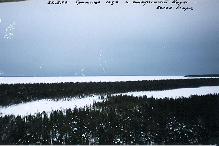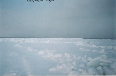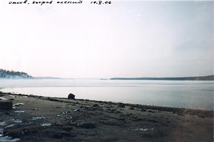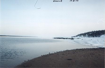 На самом деле просматривалась некая черная полоска. Таких цветов зимой не бывает (это я знаю точно): все должно быть занесено снегом. Я насторожился. По мере приближения я увидел то, чего ожидал и так не хотел. Это было вместо белого снега отражающееся небо. Там вода!! При безветрии выглядит все именно так. Это была вода. Остров Олений делит губу на две протоки. Эта протока (северная) была открытой. Сейчас был отлив, и обнажились мрачные, грязные, поросшие водорослями сплошь морские камни. Плавало пару бревен топляков. Неподвижное зеркало воды было до противоположного берега. А что за мысом было неизвестно.