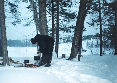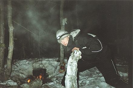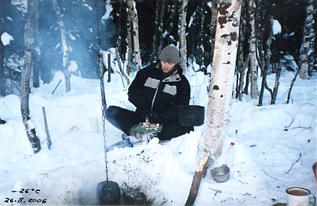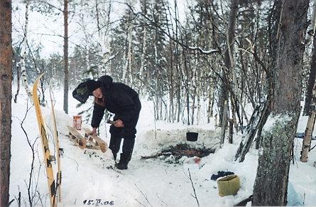 Не знаю, как Человек – Рука затолкал на горку свою динамомашину. Но моя вязла, ехать на верх никак не хотела. Рюкзаки тогда еще весили килограмм 50 минимум. Я его отвязал от саней и, проваливаясь в снег еле запер с одышкой и тахикардией. Как назло дров не было. Человек – Рука, правда, заверил, что из живой березы мы сделаем кастрик. Очень хотелось пить. Я жрал снег, но где же им наешься. Разгорелся огонь легко, но далее заниматься дрова, что были потолще, не хотели, не взирая даже на то, что Рука все использовал по научным методикам. Постоянно разгребал дрова, перетасовывал их, уверяя, сто пока под низом есть угли, сгореть может все что угодно. Костру то и дело приходил конец. Приходилось неустанно махать подсрачником. Ветра не было. Снег растопился и воды мы попили. Но закипятить не получалось никак. Эпизодически дым дул нам в морду и мне уже порядком болели глаза. Через 4 часа такого костра обоих это очень заколебало. Высказывались в коллективе идеи, а не пойти ли спать, съевши чего-нибудь такого, что не нужно готовить. Казалось, что все уже было потеряно. Сухих палок все же я насобирал. Очень медленно и очень нехотя наш золотой костер разгорелся, да так, что кидай уже хоть и сырую березу, все равно сгорит.