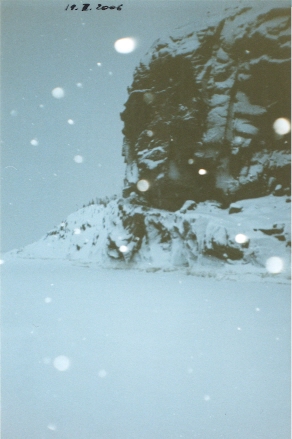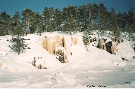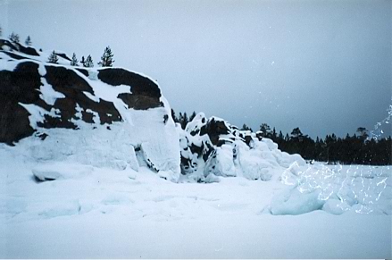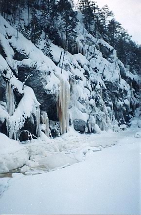 Берег очень высокий, в особенности против острова. Скальные обрывы, поросшие лесом. На камнях сосульками позамерзали водопады. И везде мокрый снег и торосы. Мороз не сильный, безветрие, ясно. Короче, получили не то, чего ожидали. Не звенящий под ногами лед, а снежную целину. Устали с непривычки быстро. Когда занялись длинные сумерки, решили, что на сегодня хватит. Стали на одном из многочисленных мысов. Собрались пройти ажно за высокий островок, что у левого берега. Но это было уже не под силу.
