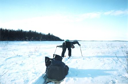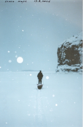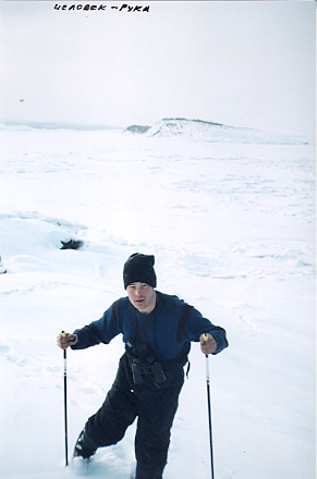 Сильный ветер ощутимо нам мешал. В сочетании с глубоким рыхлым снегом в этом месте делали наше продвижение весома медленным. Возлагалась мною надежда, что за мысом что-нибудь кардинально измениться. Обходить мыс не стали. Здесь было слишком много торосов и снежных наносов. Я решил, что срезать по неширокой косе берега будет дешевле по силам. Но на наших говняных лыжах это было нелегко. Даже на незначительную горочку с динамомашиной подняться большая проблема, соскальзываешь назад. Я проваливался в рыхлый снег, глубина лыжни была как траншея. Опираясь на палки и стоя почти раком, я совершал фрикционные движения жопой, чтобы продвинуть постоянно застревающую динамомашину (веревка цепляется за ремень на поясе.) Человек–Рука шел сзади и постоянно хотел меня подколоть. Он не наделен изящным и тонким юмором. Получается что-то кособоко деревенское и весьма навязчивое. Я огрызался в ответ.