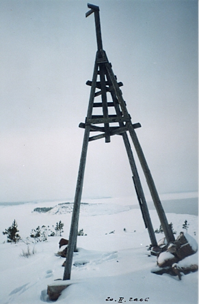 Трегопункт был деревянный и очень старый. Ступеньки лестницы дышали «на ладан». И я не рискнул по ним лезть. А стал карабкаться по перекрытиям. Высота конструкции метров 8-10. Как всегда на трегопункте, здесь насрали птицы. Сильный ветер. Видно все как на ладони и все в точности сходится с картой. Я сделал где-то пять кадров. Очень отчетливо и близко здесь сверху видна граница открытого моря. Она идет четко от мыса Кузоцкий и также четко от островов Кемь-Луды к острову Сидоров.