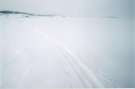 До Приморского дошли ценой значительных усилий по берегу, где навалом снега. Даже пришлось разок бросить динамомашину, чтобы проложить лыжню. В вечернем небе чернели лопасти неподвижного вентилятора. Поначалу было непохоже, что деревня жилая. На берегу были разбросаны лодки и разбитые баркасы. Тишина. После увидели мы свежие вездеходные следы, в нескольких домах горел свет. Вокруг нас набежало собак. Они лаяли, правда не особенно яростно, на чужаков. Это были в основном лайки. Предпочев остаться незамеченными, я пошел по одному из вездеходных следов. Здесь трудно было определить, который основной и ведет в Пояконду.