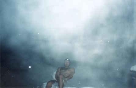 Настало время помыться. Выглядело это очень порнографически. Баня была вся в дыму, и чтобы хоть чем-то можно было дышать открыли дверь, через которую врывался холод. Видно ничего не было не столько от едкого вонючего дыма, сколько от пара. По низу от двери сильно тянуло холодом. Намылившись кое как и все это смыв водой (она хоть была теплая) я голый трусцой побежал по тропинке в дом. На удивление Человек–Рука пришел сравнительно нескоро и утверждал, что как только я ушел, тотчас сделалось тепло и улетучился дым.