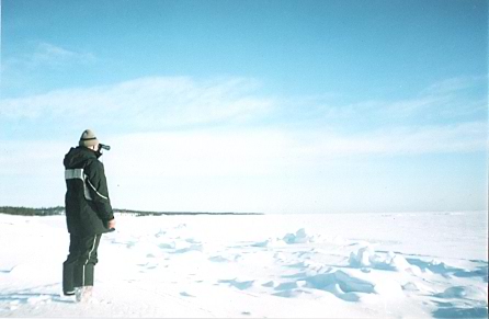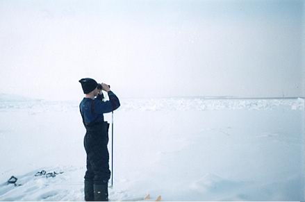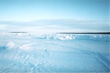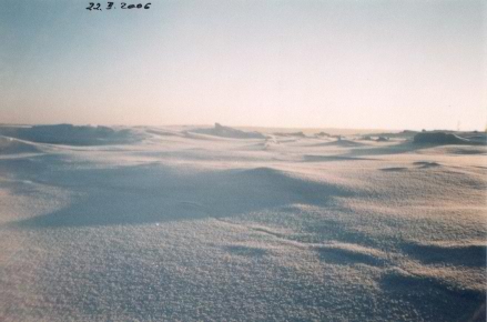 А ветер все усиливался. На снегу появилась корочка и заструги. Благо было не холодно. Змеились нити поземки. Они высоко не поднимались, а шурша проносились под ногами. События проходили в Красной Губе. Мы двигались на северо-запад. От ветра спрятаться было совершенно негде. Так и обедали на ветру. Торосы, за которыми мы пытались спрятаться, убежищем были импровизированным.