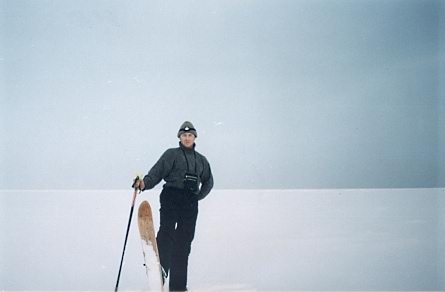 Завтракать было холодно. Ноги в замерзших валенках отогрелись не скоро. Перед выходом фотографировались и добили дополнительных поперечных палок на мою динамомашину. Минут через 10 ходьбы (езды) я почувствовал что-то не то. Куда делся снег. Пошли мы очень быстро и размашисто. Лыжни почти что не было.