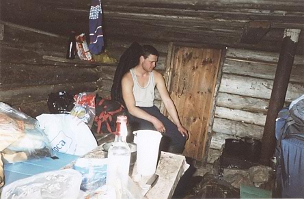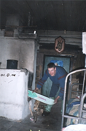 -24 градуса. Печку топить мне уже не хотелось, Человек–Рука совкался по избе, пытался топить. Тотчас атмосфера наполнилась удушливыми газами. Было здесь много шмоток, инструменты. В общем настоящий охотничий дом. Панцирные кровати, срач, на столе, наверное, еще с осени, немытая посуда и остатки каши в тарелке. Большая глиняная печь с вынимающимися кругами, запас дров (но нам не хватит). Рука продолжал хозяйничать, а я лег спать. Сильно дергало палец.