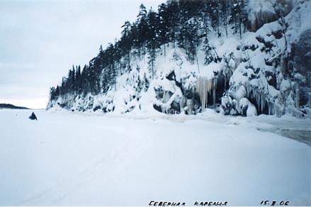 Надо же беде случиться. Динамомашиной я ударил в выступающую с виду безобидную льдинку. Треснул по одной из лыжей. Хоть у кромки, но все - таки. Еще только начало похода. Хотя такими темпами, до Беломорска мы не доедем. Можно забыть. По карнизу ехали предельно медленно и очень осторожно. А в одном месте пришлось переносить. И мы, как педики, очень осторожно, рискуя подскользнуться на игольчатой наледи, переносили динамомашины в руках, словно носилки. Сколько раз в походах зимой не был, но таким не занимался.