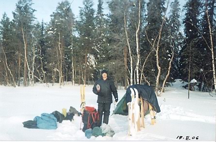 Между тем было уже 5 часов утра. Рядом, в Чупе, светились единичные огни, лаяли собаки, наверное, чуяли чужаков. Следовало поспать. Палатку ставить было невыгодно. Повытаптывали в снегу себе лежбища и легли в гетто (под открытым снегом). Снега, кстати, в лесу хватает, но прошлые разы было еще побольше.