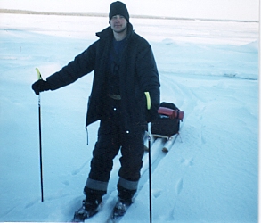 С берега я принес палки, подложить под рюкзак. Сходить туда непросто из-за луж воды на снегу - прилив. Здесь обедали, и, кажется, бухали. Собирались доехать до изб, которые, напротив (с севера) деревни Чкаловский. Уже вечерело, видимость была недостаточной. Когда очень хочешь что-нибудь видеть, ты это видишь. И мы в бинокль избу видели. Хотя та, что обозначена на карте от наших глаз должна быть закрыта полуостровом. Потиху темнело. Чкаловский все не показывался, а Нижней Полунги уже не было видно. Тропил почти всегда я. Рука тропил, но шел очень как-то медленно, я не выдерживал и уходил вперед. В магазине в Минске купил самое дорогое крепление из тех, что были. Сколько оно мне в походе крови пролило. Труднее что-либо было придумать. Веревки из-за острых штампованных углов все время рвались. Рвались и резинки. Лучше все всегда делать самому.