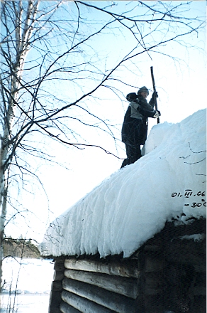Разбивали лед возле впадающей речки. Тонкими льдинками я бросался в Человека–Руку. В бане пришлось прочищать заваленную снегом трубу.