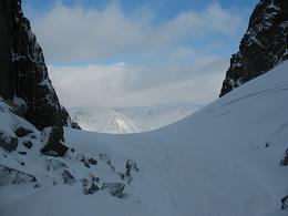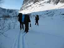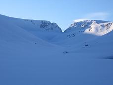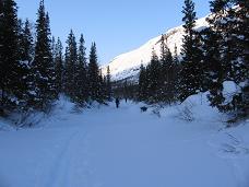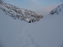 Вышли из леса, пошел подъем. Лыжи подмазали и так шли довольно долго и вот набрали немало высоты. До перевала еще было очень далеко. Скальные массивы клинообразно подступили ближе, сформировалась долина и крутой кулуар. В описаниях написано, что по этому обледенелому кулуару сходят лавины. Сейчас, согласно собранной нами информации, лавинной опасности нет.