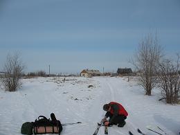 Выгрузились на задворках поселка Ловозеро. Евгений уехал. После нужных приготовлений стали на лыжи и начали делать первые неуверенные шаги. Вокруг было нечто наподобие лодочных сараев. Из-за этих самых сараев набежала большая свора собак. Собаки бегали вокруг нас, резвились, кусали друг друга за уши. Так мы вышли на заснеженные пустыри и продвигались краем поселка. Собаки постепенно разбежались и осталось четыре. Волновали они нас мало, прибивали к земле рюкзаки. Мой весил сорок.