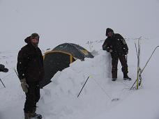 Проснулись. За пределами палатки обнаружили белое марево. Видимость была совершенно слабой. Решили, что дальнейшее движение в такую погоду невозможно. Я пошел в разведку и даже выбрался из цирка. Следы моментально заметало. Решил немедленно возвращаться, пока не потерял палатку.