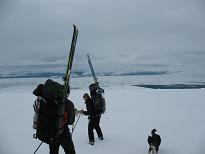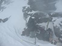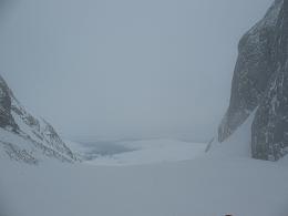Но в таком тумане, кадры весьма неспецифические. Сообразили, где идти быстро. Шли пешком, лыжи были сейчас не нужны. Шли вдоль гигантского провала, здесь гора обрывалась в цирк озера Сенгисъявр. Между двумя такими провалами, как и было задумано, вышли на пологий склон-язык и стали быстро сбрасывать высоту.