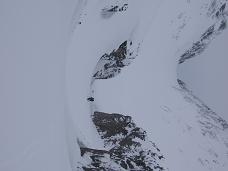 Я сходил на вершину, которая была в десяти минутах ходьбы. Вершина была представлена плохо задутой снегом мореной. Сложенный из камней тур, был исключительно примитивен. Ни записок, ни прочего там не было.