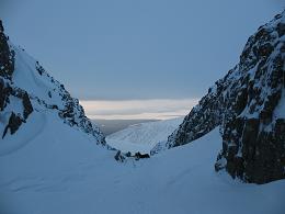 Вьюга, устроив вакханалию и дав нам немного просраться, столь же неожиданно, опустилась обратно в ущелье. Ветер затих. Мы стояли в уютном, закрытом цирке, над его белыми заснеженными стенами, вечерним оранжевым цветом воцарилось абсолютно прозрачное небо.
