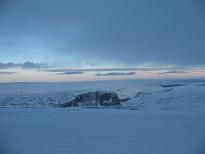 Спуск с перевала значительно более пологий, нежели подъем. Сначала двигались пешком в кошках. Потом их сняли. Потом Глаз одной ногой провалился возле огромного камня в какую-то полость. Это было намеком на то, что нужно становиться на лыжи. До Имандры оставалось 18 километров. Спуск не очень крутой. Поэтому на лыжах мы шли удобно и быстро. Ближайший плоский снежный склон розовел в вечернем солнце. Пацаны с момента спуска шли не очень хорошо. В дебри решили не лезть. С появлением первых кустов встретили уже готовую ветрозащитную стенку. Здесь стать и порешили. Не знаю что там было вчера, но сегодня обещался сильный мороз. Место последней ночевки попалось особенно живописным. Морозное небо на фоне снежных склонов казалось особенно глубоким и прозрачным.