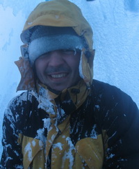 Первый час сиделось сносно, второй уже тягостно. Под конец второго часа стали замерзать мои отмороженные пальцы, как на руках, так и на ногах. Пришлось залезть в спальник. Чтобы не соскальзывать по склону, воткнуть ледоруб, в него упереть рюкзак, а самому как бы выше на него прилечь. Спрятал и голову от мчащихся снежных вихрей. Стало мерзнуть бедро, - под него положил скруток коврика.