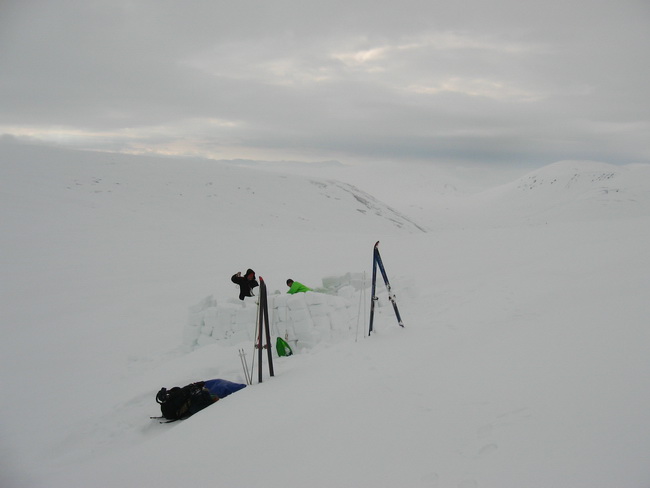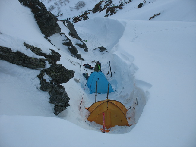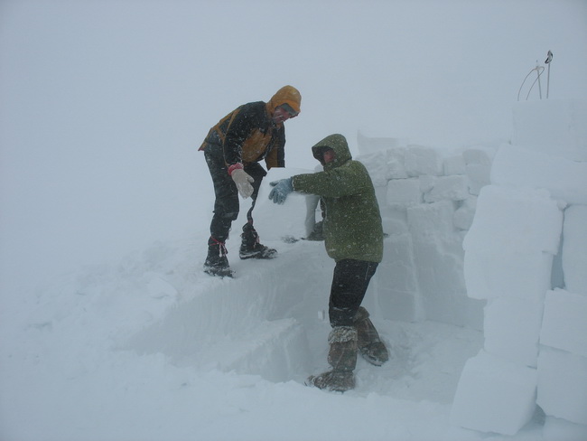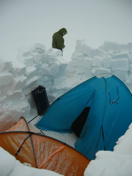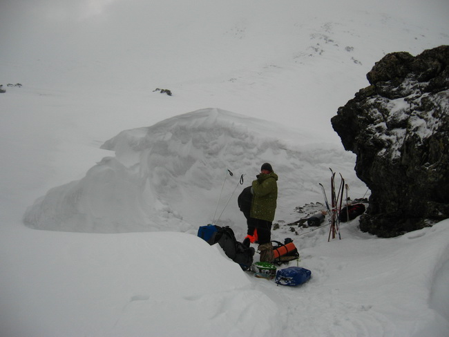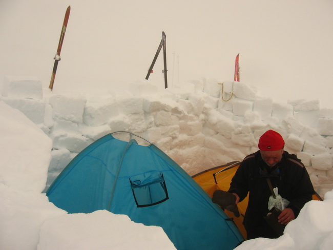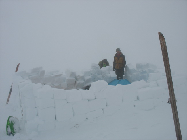 Где-то плюс один, самая холодная и сырая погода. Ведь лучше мороз. Небольшой мороз подсушивает и тогда теплее. Долго ли так лежал, коротко, выглянул, наконец, как там Дима, не околел ли совсем: я видел, что у него мокрая спина. Леня с Димой давно уже не сидели, а рыли котлован, выпиливая снегоблоки. Они ложили уже второй ряд стенки. Я тоже присоединился к строительству, что-то делать всегда легче, чем так вот тупо лежать и ждать манны небесной. Хорошо, что запомнил, где лежат лыжные палки, и их удалось откопать. Если бы по нашим следам, которые, уже, правда, замело, шел следопыт, то он бы недоумевал, зачем мы становились лагерем в таком неприглядном месте, на этом голом продуваемом склоне. Напоминаю, что по прошествии довольно продолжительного времени, погода в лучшую сторону нисколько не изменилась. Здесь ведомство мрака. Здесь погода выпадает непродолжительно и случайно.