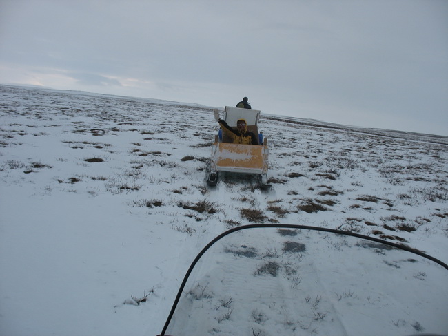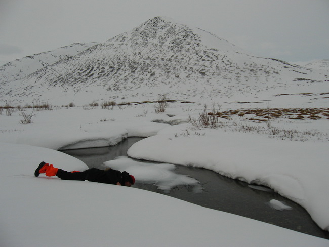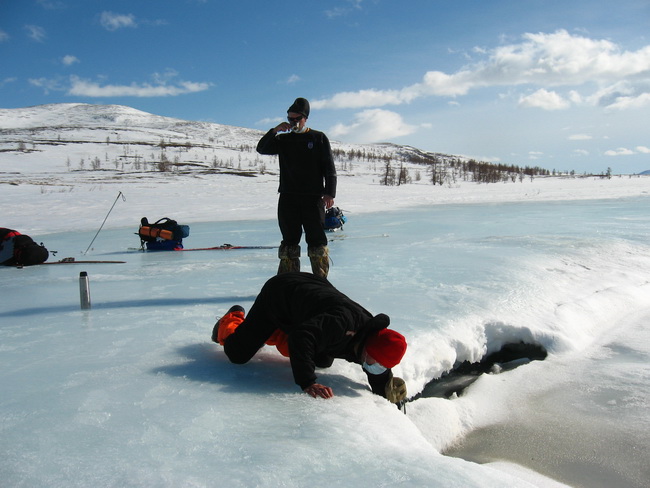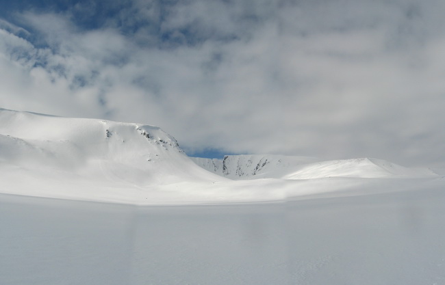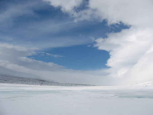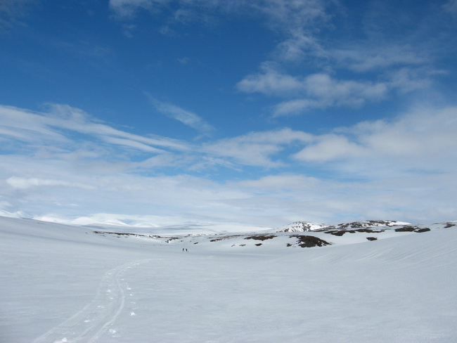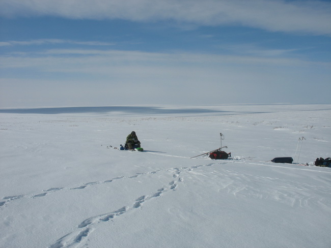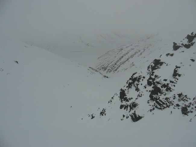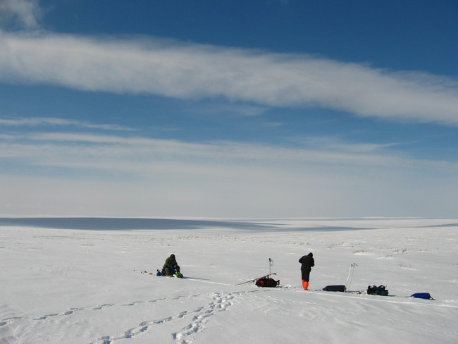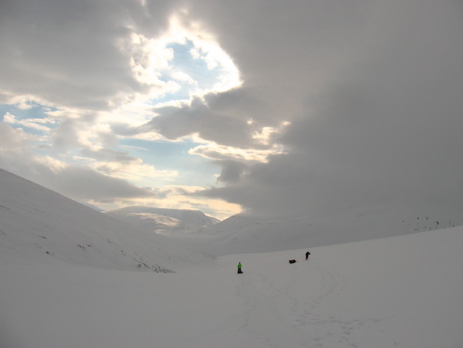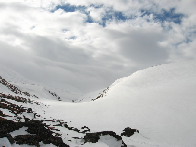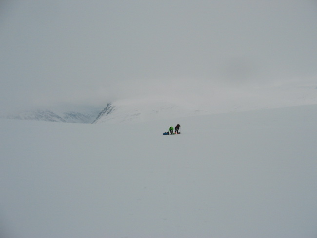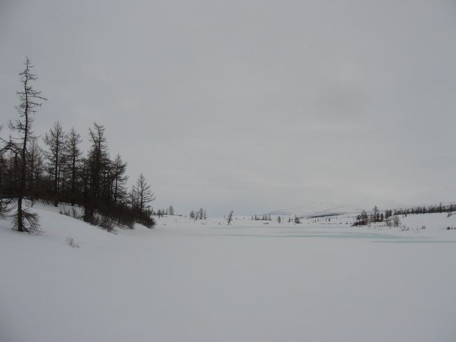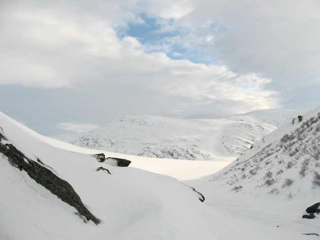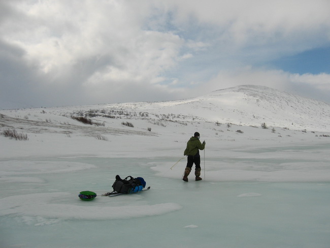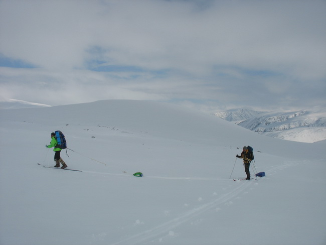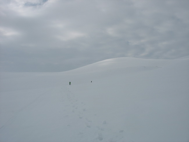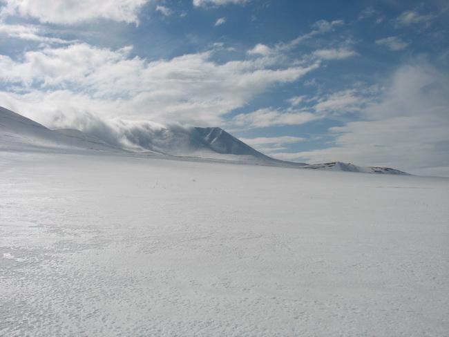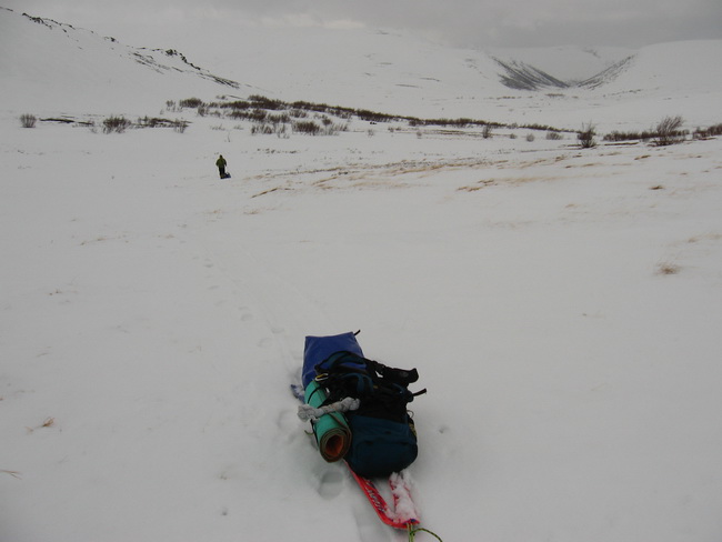 Сорок минут мы траверсировали пологий склон, пока не спустились в кулуароподобное углубление, перед которым Леня едва не свалился с края надува. Игра света совсем предательски его замаскировала. Учитывая, что шли на понижение, санки-волокуши ехали впереди, они то и указали, что больше ни шагу вперед. Надув обошли, потом по кулуароподобному углублению вышли на плоский простор, где согласно карте должно быть небольшое озеро.