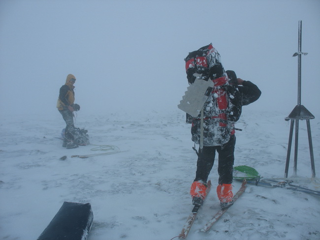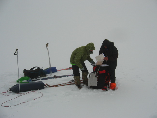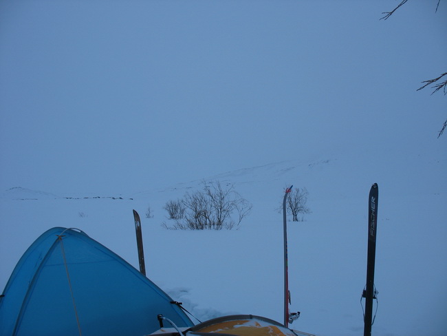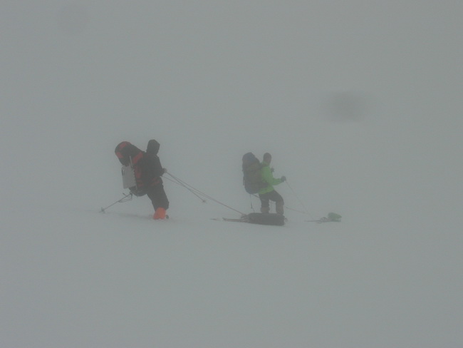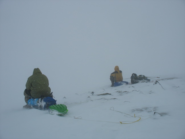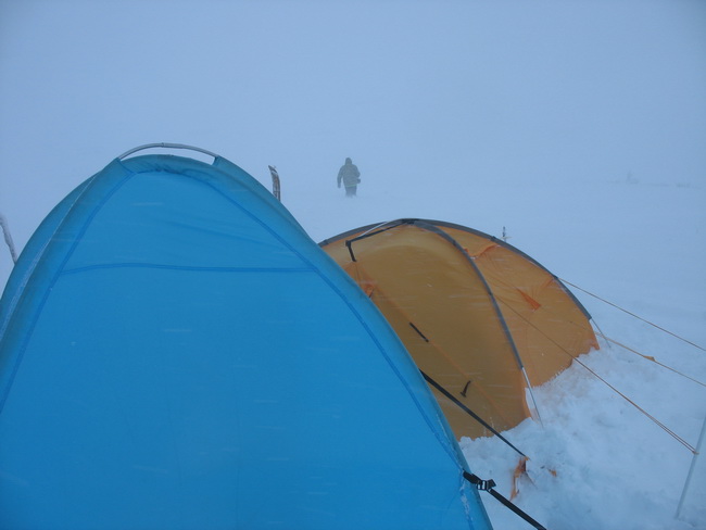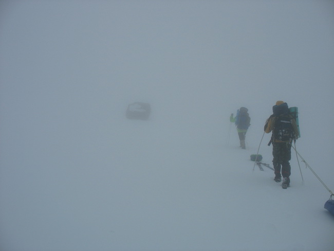 Свалить не успели. Всё, труба. Нас тоже поглотило сплошное молоко. Видимости и сорока метров не будет. Часа полтора от силы продержалось окно в непогоде. В отличие от вчерашнего, сегодня хоть не метет – уже благо.