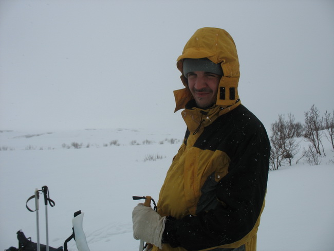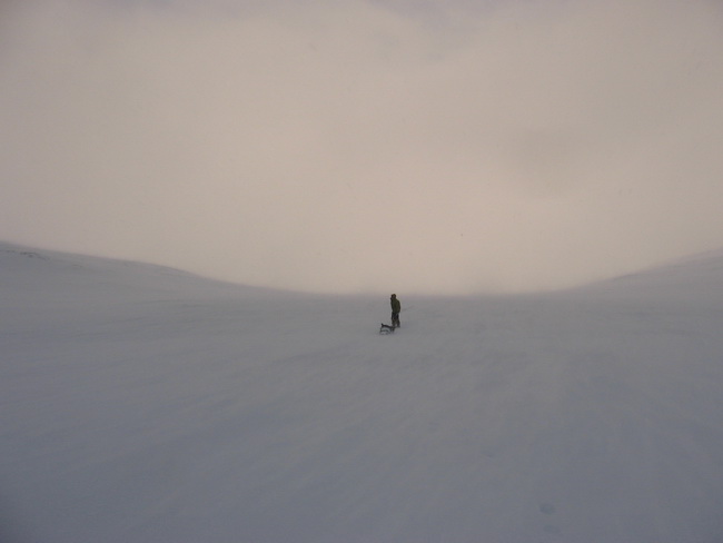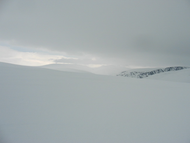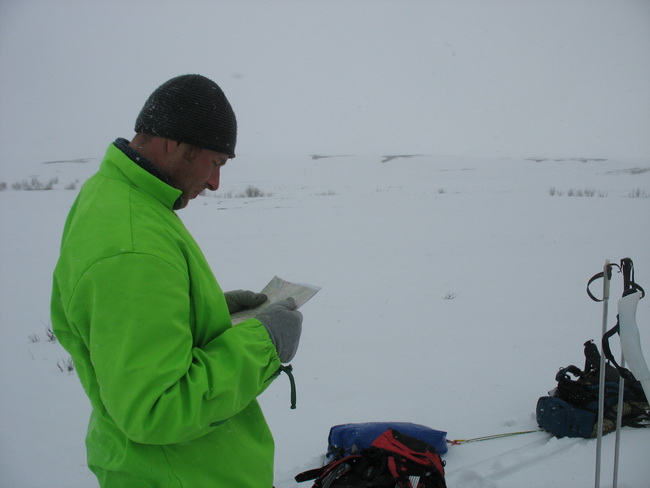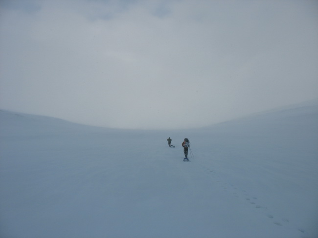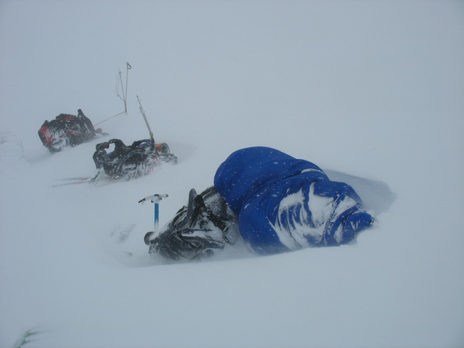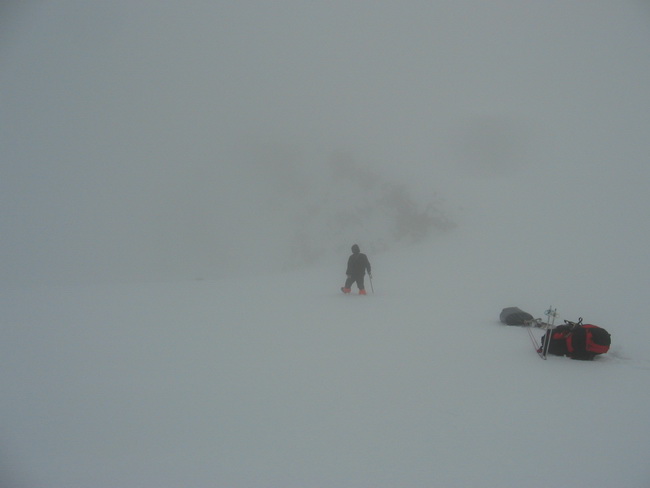 В каких-то полчаса все смешалось в доме Облонских, закрутилось, подул ветер. Полетела снежная крупа, все плотнее и плотнее. Очень быстро стала ухудшаться видимость. Такой вот он у нас непогожий 43-ий поход. Мы упорно и терпеливо продолжали косо подниматься, почти траверсируя пологий склон. Карту понимали и куда идти знали. Но не видно ни хрена, а что поделать. И так продолжался неполный час, пока мы не «стали». Кругом сплошное молоко. Видимость метров сорок. Ветер дул встречный, упруго напористый. Бытует мнение или кажется логичным, что все такое сильное и стихийное продолжается обычно не долго. Пургу решили переждать, сидя на рюкзаках. Сплошное молоко, видимость метров 40.