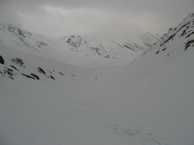 Сначала пошли полого по долине, потом в узкую щель на подъём. Глаз попутал правую лыжу с левой, походка стала, как будто насрал в штаны. На привале выяснилось, что сломал щечку крепления. Дима у нас был за ремонтника и тотчас выдал мне новую щечку и отвертку. В пять минут все было готово.