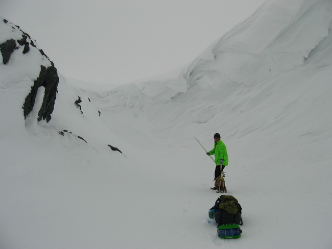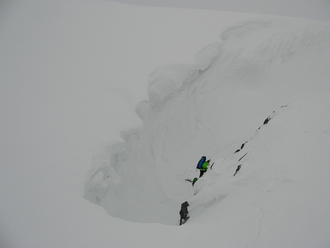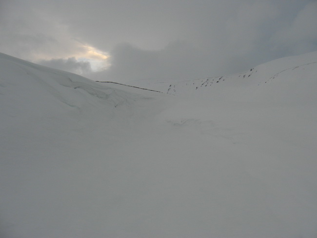 Впереди и ниже был виден весьма четкий уровень. Вариантов три. Самый благоприятный, что это перегиб склона, и два плохих – обрыв или козырек надува. Обрыва по идее там быть не должно, ибо по спускающемуся направлению, похоже, что были мы там, где нужно.