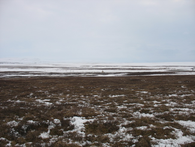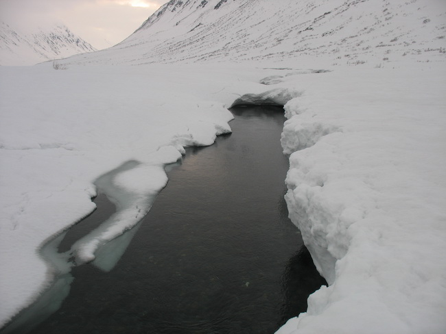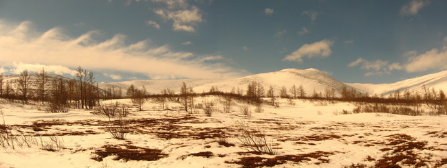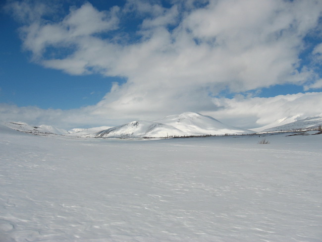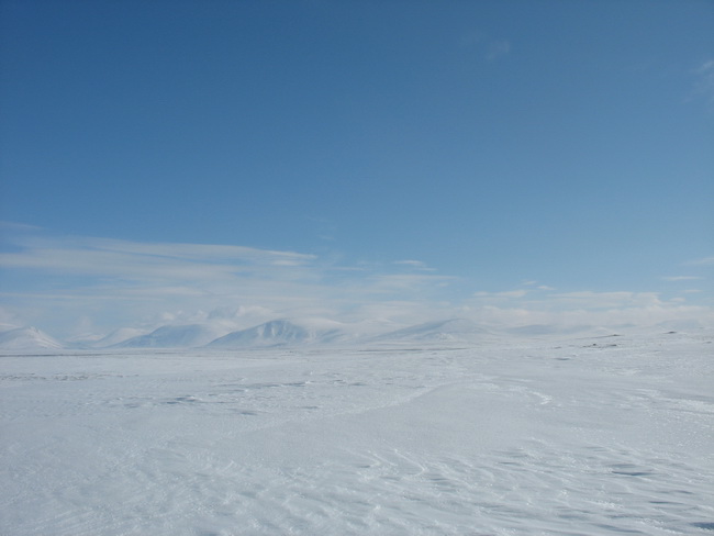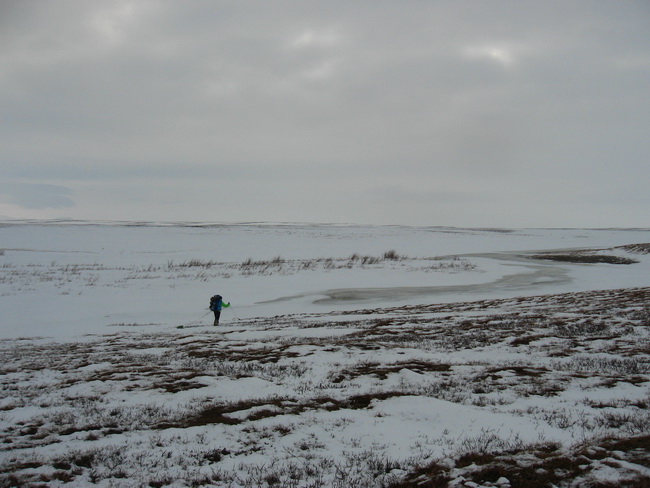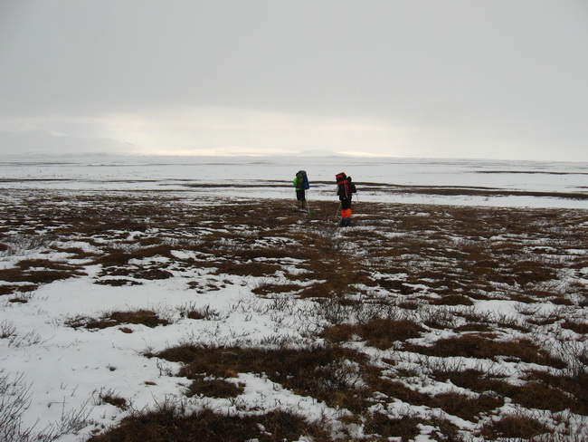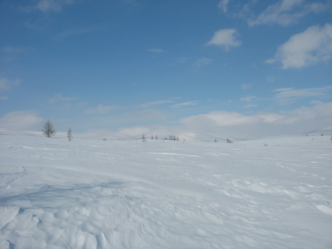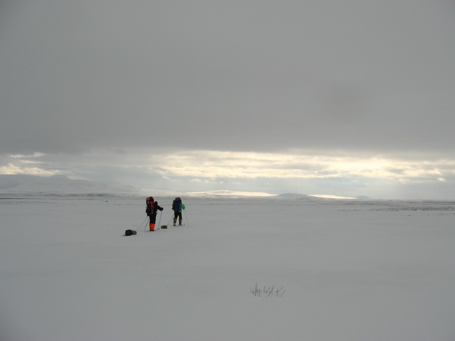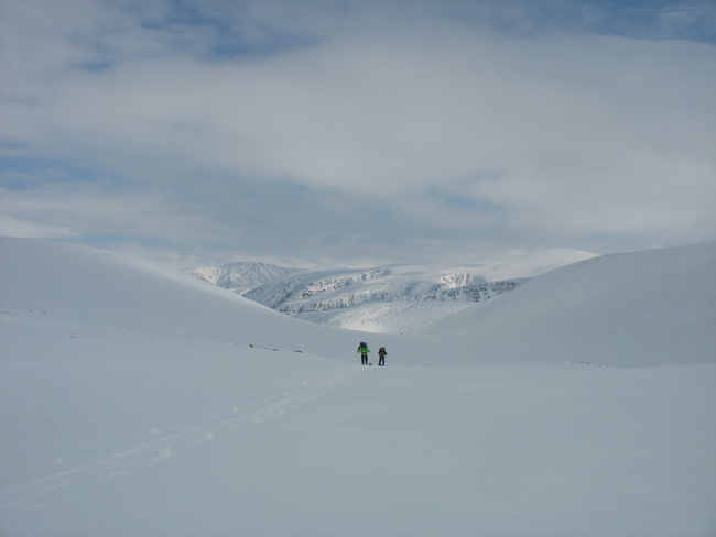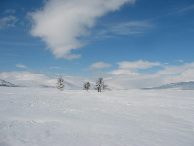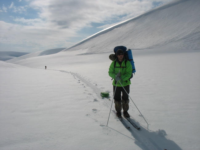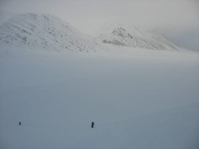 Долина Большой Усы была плоской и довольно широкой. Без каких либо признаков флоры. Вокруг ни кустика. Мы снова стали на лыжи. Подлипа не было. Прикинули время, сговорились, что идем ещё час и там становимся. Растянувшись, двинулись вверх. Уклон пока был самый минимальный и не чувствовался.