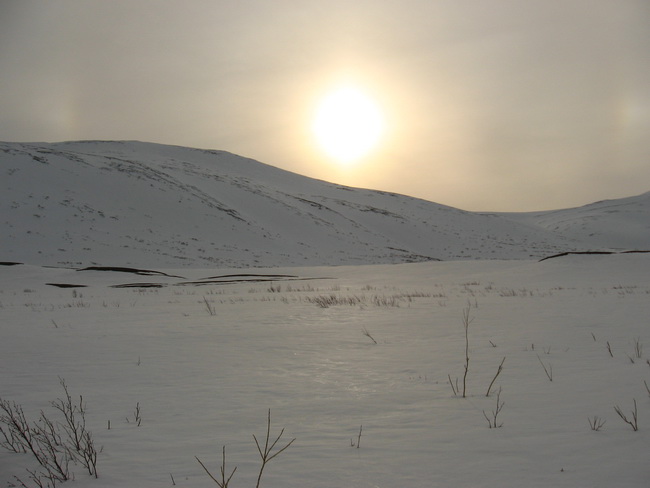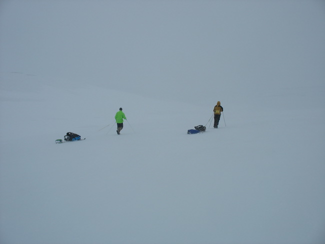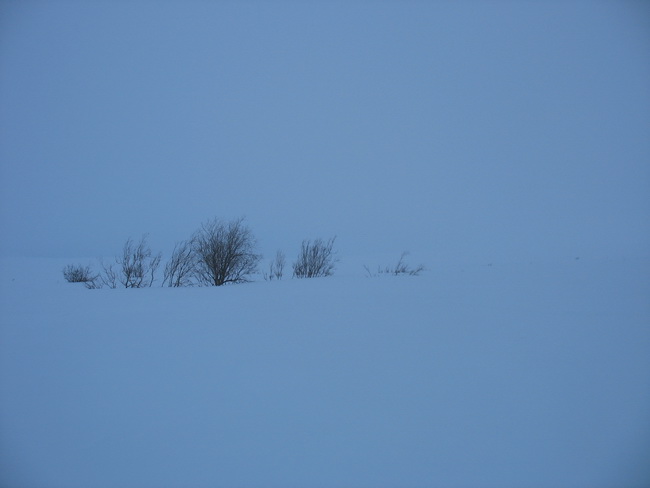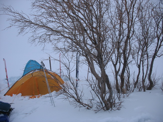 Результат дня был почти нулевой. Как ходовой он был потерян. Пройти удалось километра четыре. При той непогоде, что была до этого, можно было увидеть хоть какие-то ориентиры. Мороз в походе – это наш друг. Ветер очень мешает, но к нему можно притерпеться, а может он быть и попутным. Первый наш враг – это вот такое как сейчас «молоко».
