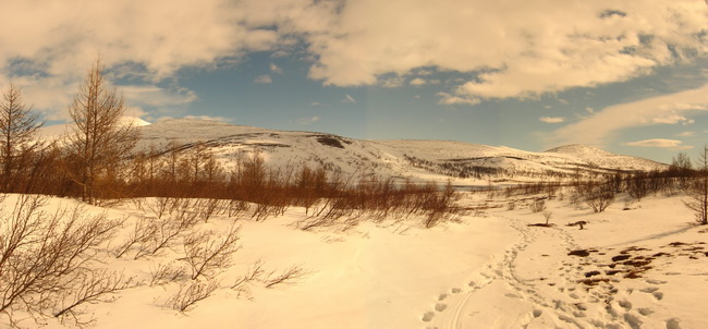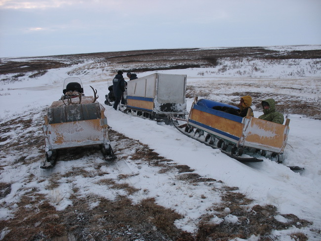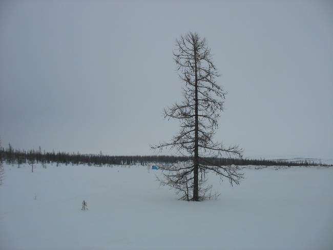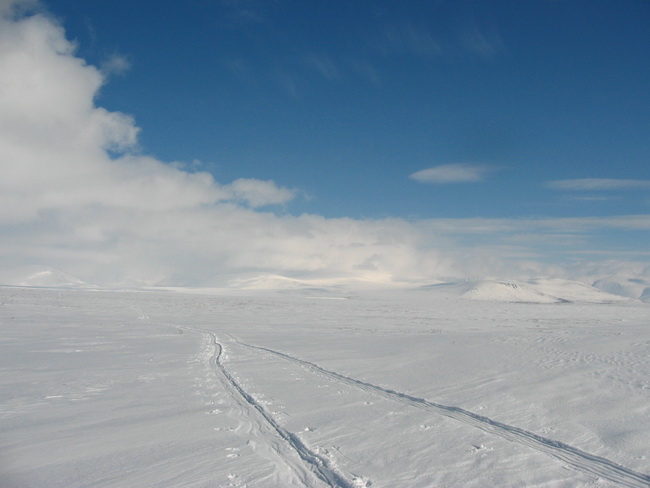 Перпендикулярно нашему движению шли следы. Это прошла туристическая группа в составе трех человек с волокушами, причем не на лыжах, а пехом.