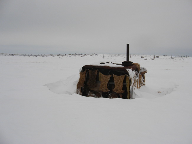 По кубатуре наше убежище получилось с сарай. Стенка была по всему периметру ямы. Уместились мы внутри с палаткой и камбузом-чумом. Смастерили удобный вход. Как раз время было уже вечерним. Если бы даже вдруг под вечер и распогодилось, уже куда-либо выдвигаться было бы не выгодно.