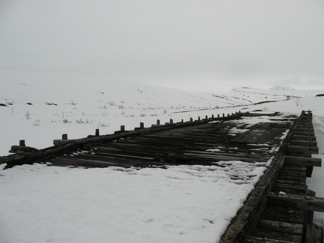 Остановились обедать перед мостом через ручей Круговой, по которому мы и спускались. Здесь когда то шла дорога в один из самых мрачных лагерей сталинской эпохи Харбей. И месторождения молибдена те давно заброшены и лагерь ликвидирован. Мы там были в Харбее (поход № 37). Фермы моста были когда то сложены из бревен на совесть. Мост был пока еще крепок, чтобы стоять пассивно, но без эксплуатационных нагрузок. Кое-где некоторые бревна и фрагменты настила были спилены неизвестными, но для известных целей - на дрова.