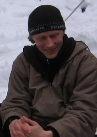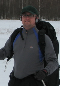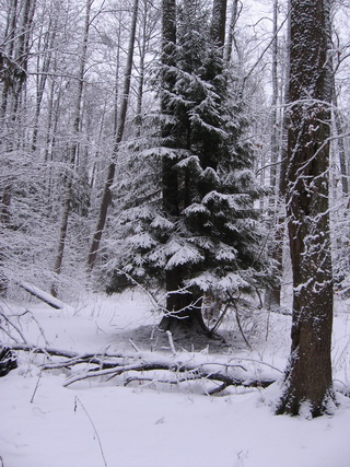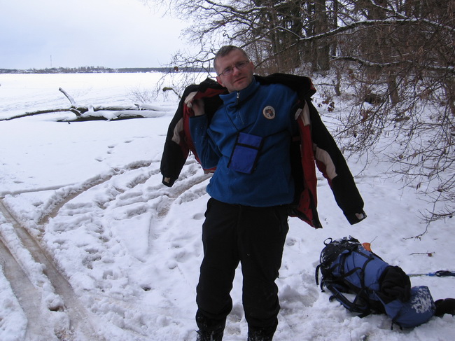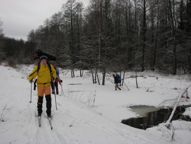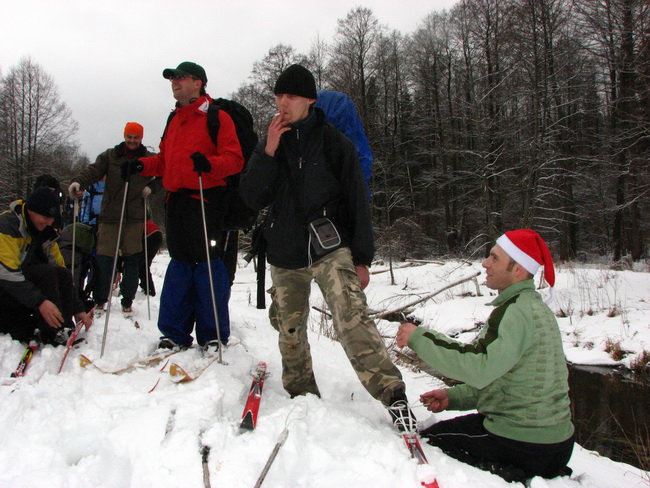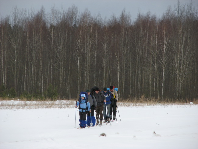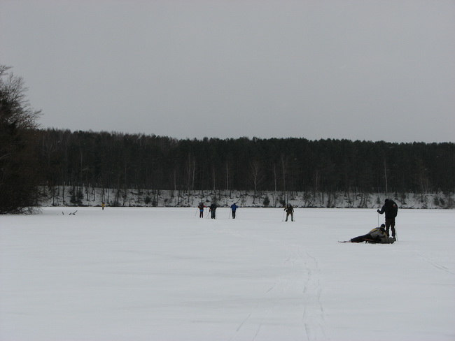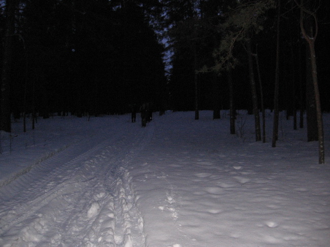 Позвонил в полдесятого разочарованный Смирнов, что в Минске выпало двадцать сантиметров мокрого снега, а значит будет и подлип. Из-за этого снега он опоздал на десять минут в Осиповичи на "прикольный поезд" и ехал теперь на такси, оставив свою машину там. Позже звонил еще раз, что одевает уже на краю леса лыжи. Лыжню после прошедших шестнадцати человек днем оказалось довольно тяжело не заметить. Он быстро догнал со своей женой нашу неспешно собирающуюся группу. Выходило по Сашенькиному GPS, что от станции они отошли два километра. Два километра были сильно в разрез с моими представлениями. Точно также и потом, пока не выяснилось, что это он сегодня меряет в милях.