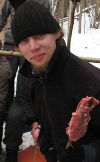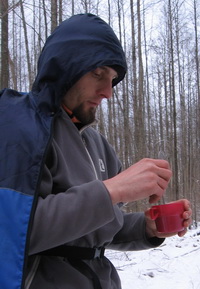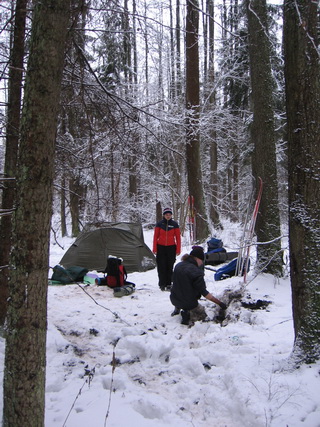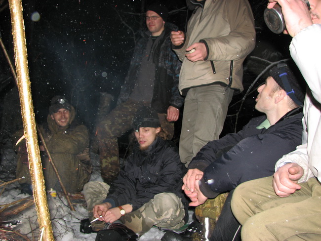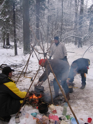 Прошли в темноте при свете фонариков километра три или четыре, пока не уперлись в канализованную реку Ботча. Здесь стали разворачиваться лагерем. Был тут не очень молодой лес почти без подлеска, ежели не считать веерообразно расходящиеся орешниковые кусты. Палаток поставили штук, наверное, семь. Неплохой бытовой организатор - Андрюша Бай - соскочил за два дня до мероприятия. Штатный повар, который бы взял на себя организацию глинтвейноварения, тоже соскочил за два дня. Группа оказалась обезглавлена и довольно беспомощна. Впрочем, теоретическаие основы процесса у многих имелись. Компания наша хороша пластичностью и способностью импровизировать. Белое вино смешивали с красным, в темноте все равно не видно, да и красного на вскидку было больше. Добавляли еще что нужно: корицу, гвоздику, сахар.
