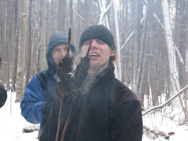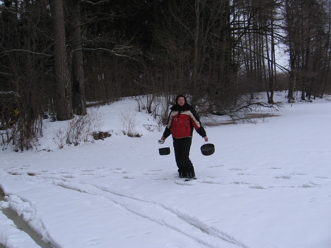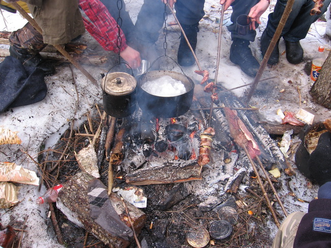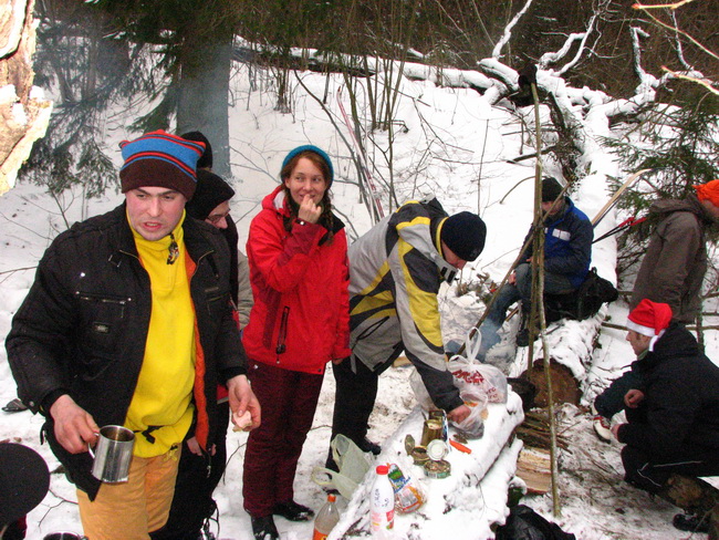 Такое именно место здесь и было, где мы устроили обед. Именно здесь было, как нигде, тихо. Поблизу значительно сухих еловых дров, которые горят сами по себе. Костер не заставил себя ждать. Желто оранжевые тощие его языки стали бегло облизывать дрова. С ним и подоспел чай. На почти горизонтальном вербном стволе сорганизовали импровизированный стол. Половина группы стала бухать и вести задушевные разговоры.